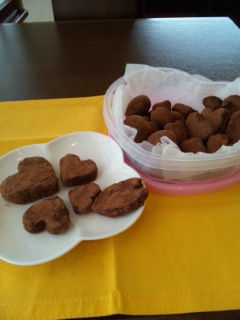 お疲れ様です~お知らせ~明日、13日第二日曜は定休日のためお休みさせていただきます今日はな~んとか天候が…曇り…時々雨にもなりましたがでも、風が凄い(;  ̄Д ̄)気温も下がってるようだし風が冷たい体調管理を気をつけないと。。。今日は冷蔵庫に冷やしてあった生チョコを型とってみましたぁ~と言うか。。。娘が起きてすぐに「生チョコ~」と言い出してたし…そんな事だけは と~っても暗記力がィィ娘です時間を見つけ息子も張り切り完成~それがこれ~子供の体温ですぐとけちゃうんですよ[◎´-Д-]bネ…もう途中から姉にも助けてもらって…ワケ解らない形になったんですけどでも、味は。。。グ━d(´ε`●)━(〇´3`)b━♪くろーばー も完成~子供達は掌真っ黒にしながら楽しかったみたいです寒い中、ご来店くださったお客様ありがとうございましたまたのお越しを 心からお待ちしております