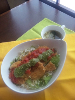 まだまだ日差しが暑いですこの残暑のおがげで、諦められない事が・・・それは、かき氷を終了する事を悩んでしまいます『そんな事かいっ』 って言われそうですがお子さんの注文があったりするので 悩むんですよね暑さと相談しながらしかないのかなぁ と、悩んでいても もう秋メニューになってるんですけどでは秋メニューの紹介を ハーブソルトの炭火焼チキンサラダハーブソルトで下味をしたチキンを炭火焼、香ばしいチキンと野菜がまた合うんです一度お試しくださいご来店くださったお客様ありがとうございましたまたのお越しを心よりお待ちしております