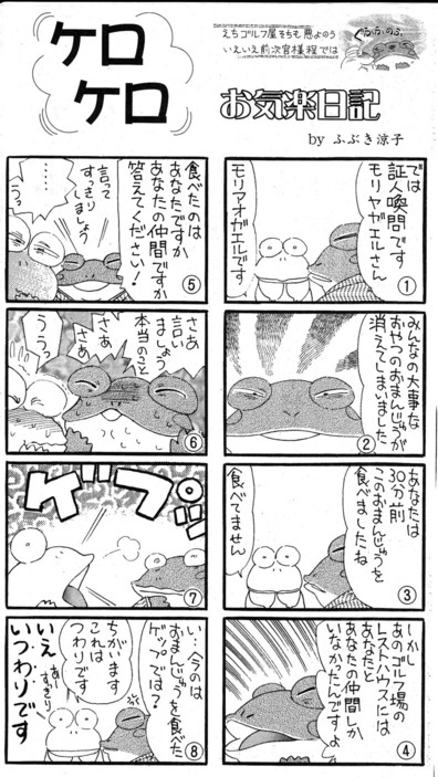 「狸の論理」その3の前に、赤旗の面白い漫画をご紹介。赤旗のなかでも、電ボが唯一楽しみにしているのが、漫画家ふぶき涼子さんの8コマ漫画「ケロケロお気楽日記」です。電ボに言わせれば、赤旗のなかでお金を払って読む価値があるのはこれだけです(断言)!!なんてね。でも、ふぶき涼子さんていう漫画家、ググってみても出てこないんですよね。まだ駆け出しの漫画家さんなのかなぁ?それはさておき、本当に面白いですよ。カエルが主人公の漫画なんですが、そのときの時事ネタを盛り込み、ピピリと山椒を効かしたような笑いを取るんです。それでいて赤旗のように説教くさくない(これ重要。例えば赤旗の連載小説なんて説教くさくて読めたもんじゃないんですよ、実際)。ちなみに今週のケロケロお気楽日記↓は、今話題の防衛省守屋次官ネタでした。 なかなか面白いでしょ。何気に漫画タイトルの上の「えちゴルフ屋そちも悪よのう/いえいえ前次官様程では」なんて挿絵も、芸が細かいな~と感心した電ボなのです。でも、月に2回しか連載されないのが残念です。それに載っているのが赤旗というのがねぇ~。もっとメジャーな日刊紙だったら人気がでると思うんだよなぁ~。もったいない。
