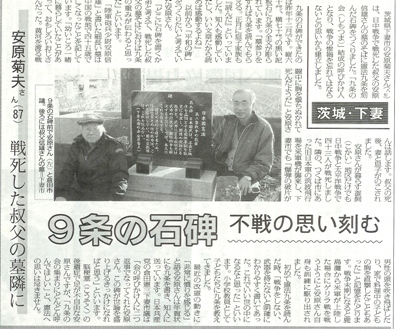 久々の更新です。今年も不定期に気ままに書いていきます。さて、久しぶりに赤旗の「痛い」記事を見つけたので取り上げました。その記事というのがこれ↓(今頃画像のUPの仕方をマスターしました)痛いですね。かなり痛いです。叔父さんもまさか自分の墓の隣にそんな石碑を立てられるとは思わなかったのでは。故人の気持ちにお構いなしに、よかれと思って自分の思想を押し付けるサヨクの一面がもろに出ていますね。こういうことされると却って普通の人は引きますよ。わからないかなぁ~。わかんねえだろうなぁ~。