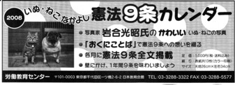 「狸の論理」と戦争責任【その3】を書かねばと思っているのですが、その前に面白い広告を赤旗紙上に見つけたのでご紹介。2008いぬ・ねこ・なかよし憲法9条カレンダー↓う~ん。どうなんでしょう?正直電ボにとってはキモかわいい(笑)としか思えん。いぬ・ねこと9条を絡めるなんて(いぬ・ねこに失礼です)。「おくにことば」で憲法9条への想いを綴るなんて、護憲派以外の人が見て共感するんだろうか?壁にかけ、1年間9条を味わいましょうなんて、まるで標語や格言の世界ですな~。こういう類のグッズを、なぜか護憲派は一生懸命作っているのだが、それ以外の人間にとっては「キモい」とか、「頭おかしい」とか受け取られると想像した事はないのだろうか?それとも、本当にこういったグッズを使って訴えれば、自分達の主張が受け入れられると信じているのか?もし本当だとしたら正に憲法9条教徒というしか思えない。いわしの頭も信心から、といった感じだろうか。本来の議論で相手を納得させることも出来ず、こうしたグッズで自分達の主張を広めようとする姿勢は、はたから見て滑稽かつ哀れにも見えてしまう。しかし、考えてみるとこうした人達というのは、神がかり的で論理で納得するような人々ではないからその考えを変えるのは非常に難しいものがあると感じざるを得ない。説得は無理でも、彼らの考えを論破し、こうした人々の主張をこれ以上広めさせないこと。このことが重要だね。