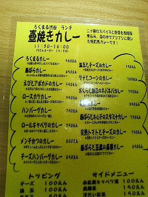 本日のお店はろくまる 渋谷公園通り店に行ってまいりました。お店は渋谷駅より丸井シティまで行きパルコ方面に左折してください。坂道の途中にお店はあります。夜はモツ鍋をうりの居酒屋ですが、ランチは10種類の野菜を煮込んだカレーです。今回行った時、偶然にもランチの割引き件を発見!!ラッキー▼通常は650円のカレーが500円に・・・。▼豚バラカレーをチョイスです。▼カレールーの入れ物が壷これでカレーがいつまでも冷めないようになっています。▼お味は、野菜をコトコトに混んでいるだけあって、コクと深みがあります。口の中でカレー独特の風味が広がるというより、ビーフシチューを食べた時の感覚に近い深みがあります。立ち食いやスタンドカレーは一度食べると飽きがきますが、ここのは近いうちにまた来てもいいかなという味です。とりわけ、目新しいものがあったのかと言われると・・・・ないです。ですが、深みのあるカレーとはこんな感じでGOODです。500円でしたし・・・。ウマウマ