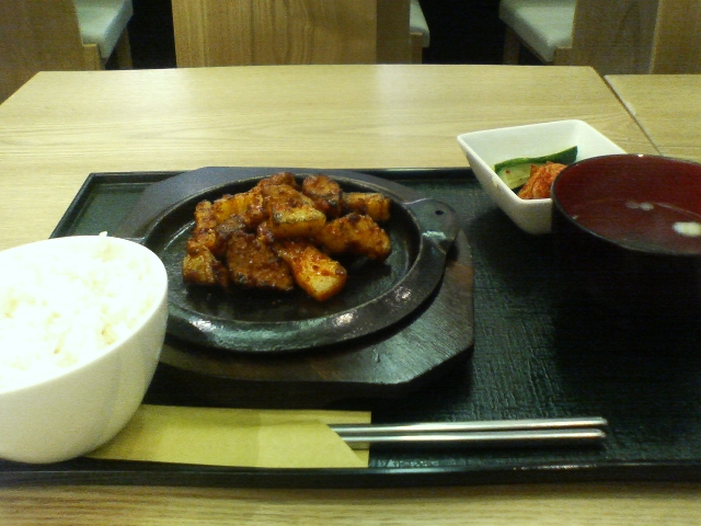 今日ご紹介するお店は韓国料理のぶるだっくです。ここは、韓国の「トッポッギ」・「ぶるでじ」といった辛ーーーい食べ物を売りにした、韓国企業のお店である。TV東京の番組ガイアの夜明けにも紹介され、一度は行こうと考えていた店に、ついに突撃する召集令状が天より舞い降りて来ました・・・・。最初は店のHPを見ていて、夏メニューのうなぎ丼が食べられると思いワクワクで店に。今日からメニューが変わっている。ガーーーん。あまりにもショックで注文するのを忘れていました・・・。しかし、お腹と税金の支払は待ってくれません。それではと、改めてメニューを見直しぶるでじ定食に決めました。鶏肉バージョンんと豚肉バージョンがあったのですが、国内産豚と書いてあったのでを豚肉をチョイスしかも、この店で一番辛い料理に挑戦です。最初の一口は豚のジューシーで甘みを感じていたのですが・・・食べて行くうちに辛さがジンワリと・・・・・カプサイシンが働いてきたようです。付け合せのキムチが全く辛く感じません。お吸い物を飲むと下がヒリヒリご飯の暖かさでヒリヒリ汗がダラダラ・・・辛い料理が好きな人には、うってつけの定食です。ただ一つ気になるのが、かなりピークを過ぎているのたが、従業員の対応が遅かったのが気になる点。13時過ぎにいったのだが回せていない。ピーク時に行ったらどのような対応になるのかが心配である点。店のHPもリンク切れやリンクが違ったりと・・・そんな感じの店員の対応です。まぁ、愛想は良いので、頑張って仕事している感じがするので、それはGOODです。味自体は、問題ないので二つ星次回、もう一度対応を見てみたい。