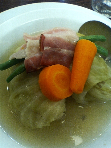 今日ご紹介するお店は『つばめグリル』です。シチューが食べたくなって、出かけたのですが・・・・ランチメニューにはなく、一般メニュになるようです。ランチ時でも一般メニューを注文する事は可能ですのであしからず。しかし、ランチメニューを見ていて・・・・ロールキャベツが気になり注文していました。 ニンジンもしっかり煮込まれており、柔らかくウマウマでした。ロールキャベツもしっかり芯まで味がしみこんでおり旨味を十分にかもし出していました。ツバメの特徴としてあげられるのが・・・トマトのファルシーサラダが付いて来るところです。トマトのコンポートとでも言うのでしょうか。丸ごと一個ついてきます。 これがまた、旨いんです。これを目当てに来る人もいる見たいですし・・・・。写真はありませんがハンブルグステーキもです。