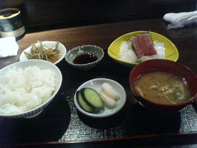 今回ご紹介するお店は和食のお店 『旬作』です。先日牛ワサビ丼を食べた『とうか』のすぐ近くにあるビルの2階です。和食がおいしいお店です。ランチメニューは、てんぷら定食焼き魚日によっては煮魚などがあります。今回頂いたのはお刺身定食です。 お刺身は、イカと鯛とマグロどれも今日買ってきた物ばかりだそうです。お味噌汁の出しも効いていて、おいしかったです。カウンターのみの座敷で、和食やだけあって静かな安らぎを感じるお店でした。