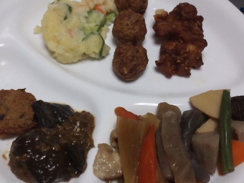 夏野菜と肉団子のぐる煮です。ごま油で野菜を炒め肉団子を入れます。酒少々を入れ、塩こしょうで下味を調えみりんと醤油で味付けです。最後に片栗粉でとろみを付けます。ごま油の風味がいいですよ。野菜は残り物を利用しました。此処では、キャベツ、ピーマン、シシトウ、人参、玉ネギ、メキシコキュウリなどを使いました。彩りよくまとめるのがおいしさをアップしますね。トマトを入れてもいいかな・・・ 残り物 目先をかえて 再利用 美味しい一食 うれしい食事 ゆう残り物も再利用で新しくなります。