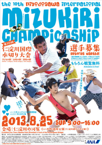 8月25日にあります。詳しくは下記をご覧下さい。当日、スタッフとして参加しています。夏の1日、あそびにおいでませんか?お待ちしています。+++++++第10回国際水切り大会+++++++++++*****http://niyodoriver.com/mizukiri2013/水切りとは、河原の石を川面に投げて、水の上を跳ねさせる「スポーツ」です。この大会では、男性・女性・子どもの計3部門で、美しさ・飛距離・回数の総合評価で順位を競います。水切りに国境はありません。この夏、仁淀川で水切りの世界王者を決めようではありませんか。開催日時[日 時]2013年8月25日[日][会 場]高知県いの町波川公園(仁淀川橋下の河原)[受付開始]午前9時[競技時間]午前9時~午後4時[参加費]大人500円・中学生以下300円 ※当日参加は大人800円・中学生以下500円 ※人数制限あり[申し込み〆切]8月18日[Location] Ino Town Hakawa Park (Riverbed in front of the Niyodogawa Bridge)[Competition]2012.8.25 sun 9am – 4pm ,Registration starts at 9am.[Entry Free] Adults:500JPY,Children up to age15:300JPY. 参加申込は8月18日!下の申し込みフォームからエントリーしてください。〆切は2012年8月18日です。[Entrys Wanted]Registration may be completed via fax using the sheet below, or from PC or mobile phone browsers.http://form1.fc2.com/form/?id=507671★川が荒れている場合は中止です。中止の場合、前日21時にHPで発表します。★水切りで投げる石は自分で拾ってください。★観覧無料