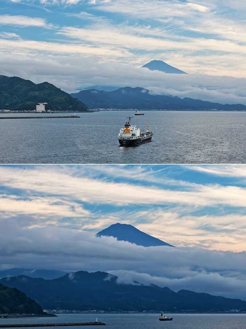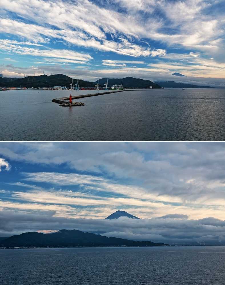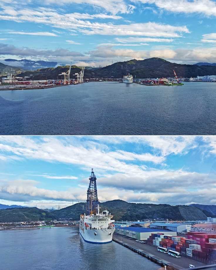 興津ふ頭には、 地球深部探査号 「ちきゅう」が停泊していた。その前に縦列に並んで接岸する。探査号「ちきゅう」は、海底下7000mまで掘削できるとされる。世界トップクラスの掘削能力を有する探査船。定期的に船内の見学会が開催されている。