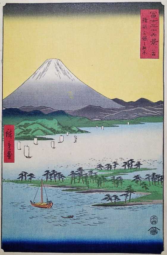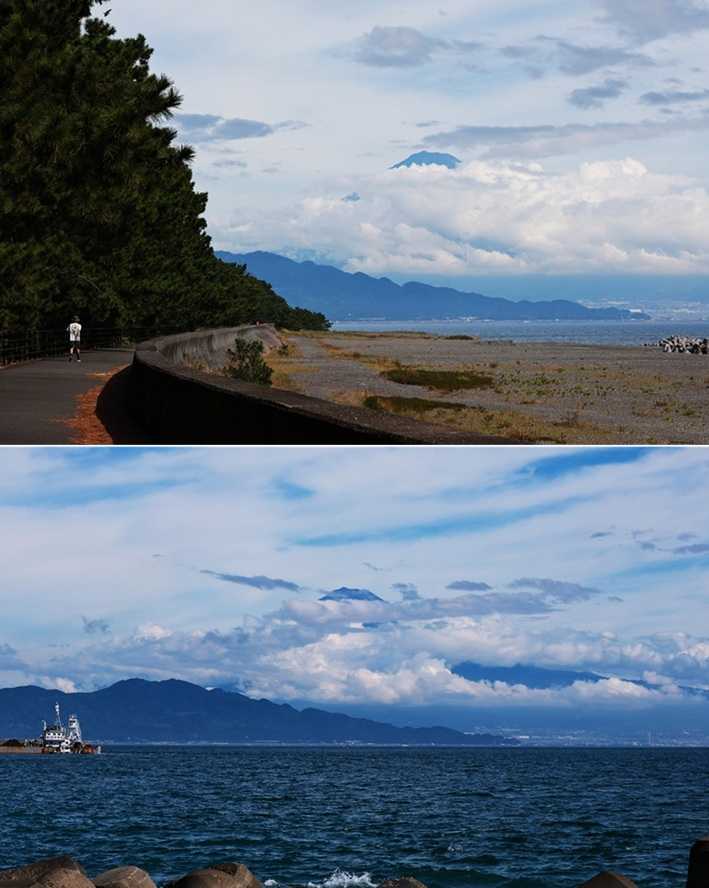 三保松原(みほのまつばら)は約5kmの海岸に約3万本もの松が生い茂っている。富士見の絶景場所と昔から知られている。松林の緑、打ち寄せる白波そして富士山が見える構図が「絵」になるのだ。歌川広重の富士三十六景「 駿河三保松原 」や多くの絵画や和歌に詠まれている。訪れた日、雲懸かった富士山を観る。