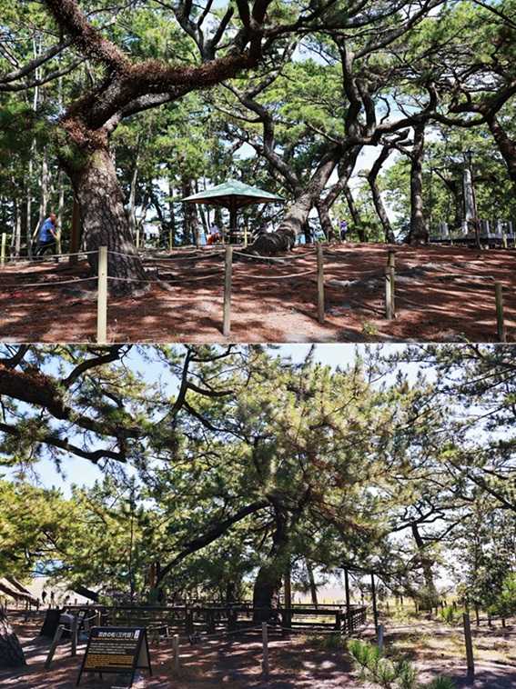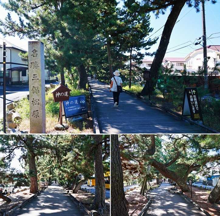 三保松原の一角に、天女伝説として知られている「羽衣の松」がある。半島の中心に向けて、 御穂神社 (みほじんじや)の参道が続く。この参道は「神の道」と呼ばれ、樹齢300年から400年の松が500mに渡って続く。風の強い日、あるいは照り付ける日差しを和らげてくれる松並木だ。