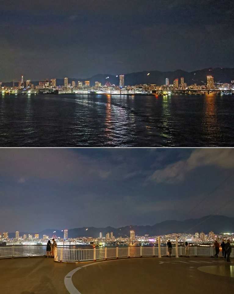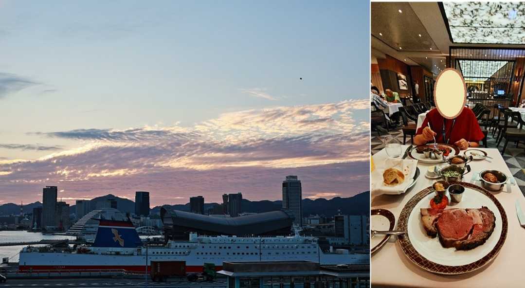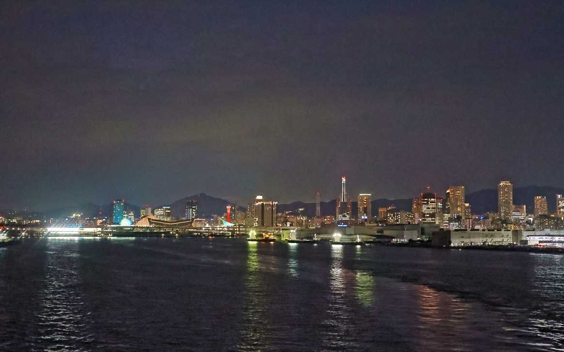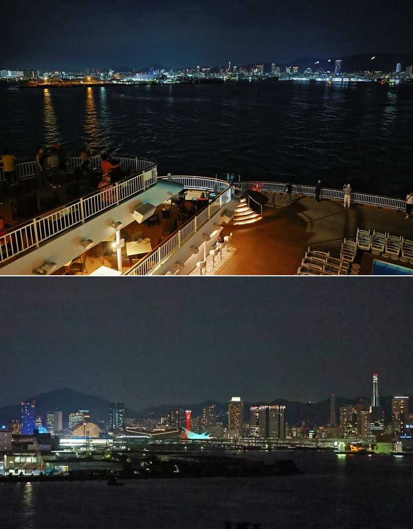 神戸出港18時なので、夜景を見るために早く食事をとる。スペシャルレストラン・ステーキハウスで大きなステーキが出されたが、外人サイズの大きさで、とても食べきれるものでない。デザートをたいらげて、13階デッキに上り、遠ざかる神戸港の 夜景 を楽しんだ。