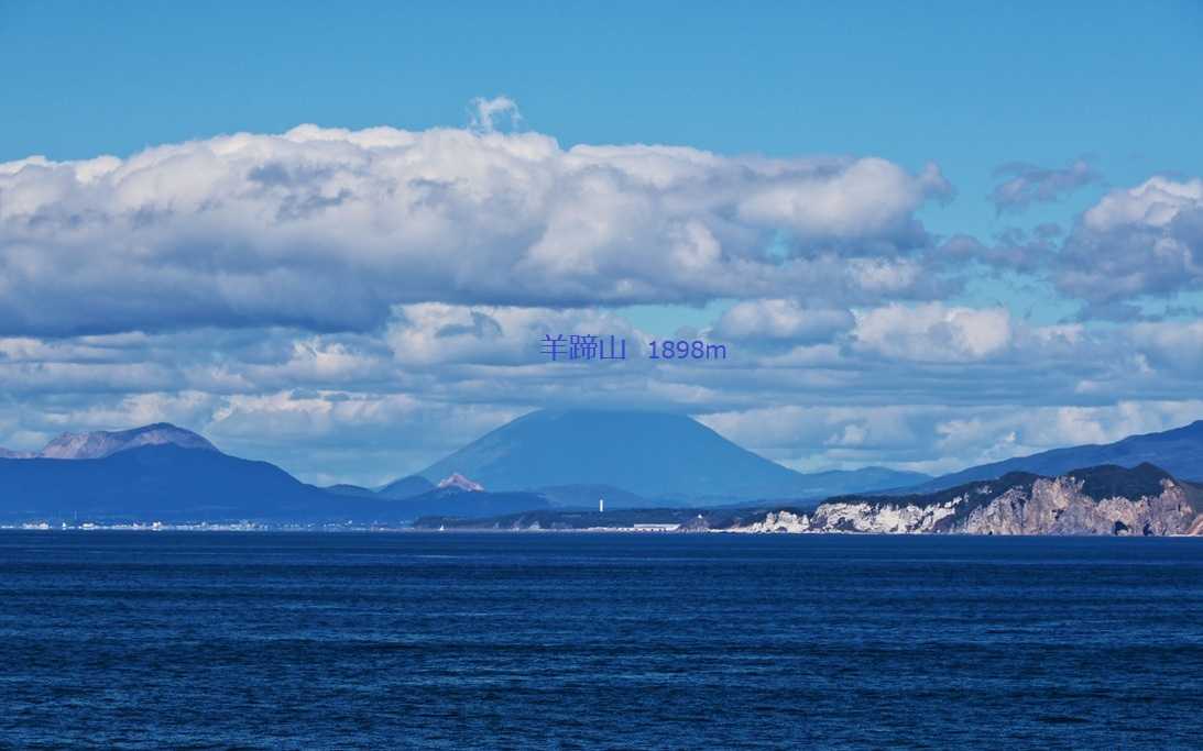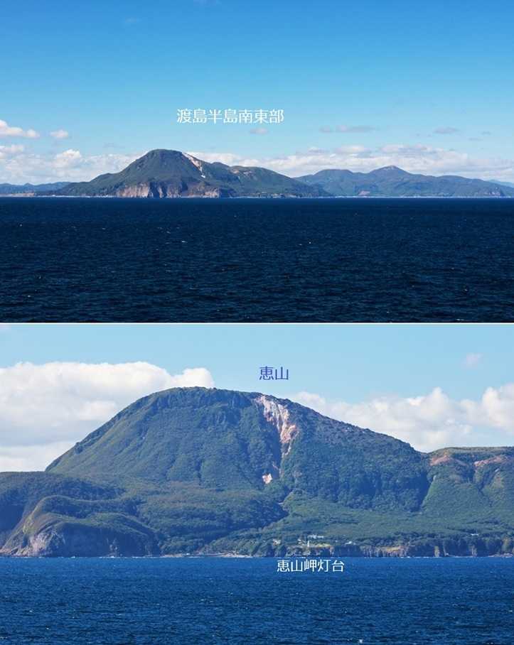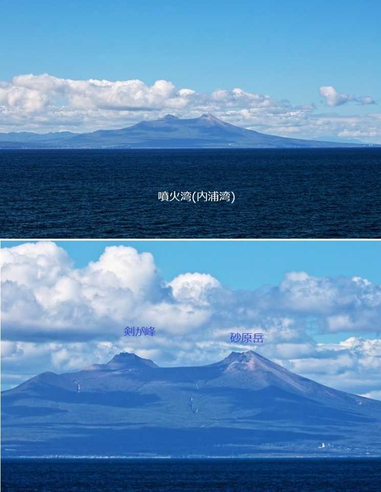 渡島半島南西部(亀田半島)を過ぎると、大きな噴火口をしたような 噴火湾 (内浦湾が正式)となる。噴火湾越しに、特徴的な山容の駒ヶ岳(標高1131m)と砂原岳(標高1112m)を眺めることができる。しばらくすると、洞爺湖の奥に蝦夷富士と呼ばれる羊蹄山(標高1898m)が見えた。