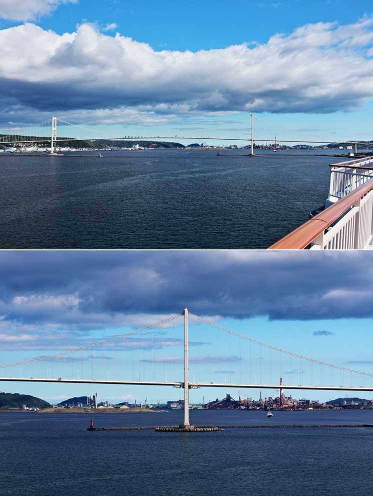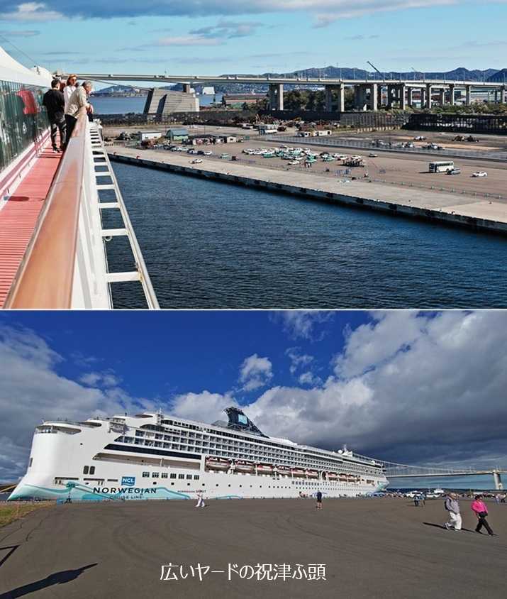 白鳥大橋 のたもとに当たる祝津ふ頭は、数年前に大型船が接岸できるように整備された。岸壁長410m×水深11mに改良して、22万トン級の超大型船まで対応できるという。駐車スペースは十分あるので、雨風をしのぐターミナル施設が欲しいところだ。バスを利用すると、登別温泉や洞爺湖などの日帰り観光も可能だ。