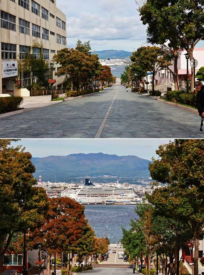 写真6 八幡坂の石畳みと港風景。