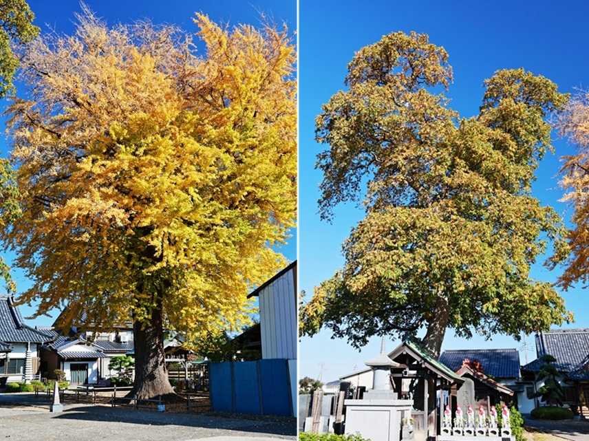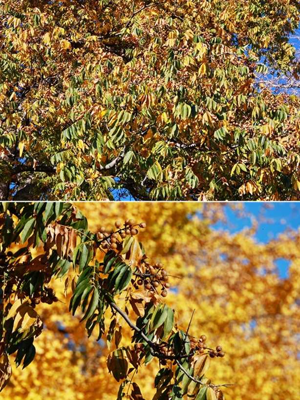 近くのお寺の境内中央に、大きな 銀杏 (イチョウ)と 無患子 (ムクロジ)の樹が対で立っている。黄色に色づき、実が落ちる頃、散歩のコースに欠かせない。晴れた日、暖色に包また黄樹を見ると、見る方も温かくなってくる。