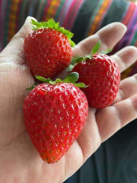 庭のとちおとめ赤くなりだした。そうなると鳥がかぎつけてくる。初なりの形の良い実があぶな明日には収穫収穫し思っていたらいたらその朝にはやられてしまっていた。悔しいのなんのって。そこで赤い実の部分を種芋のはいってい網の袋袋をかぶせておいたら無事とられずに済んだ。