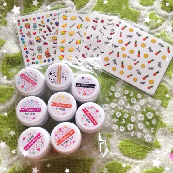 ネイル工房さんでお買い物♡ popteenシリーズ第2弾! 追加注文します(∪^ω^) シールは半額でした! 左上が写ネイルです。 比べてみると、パイナップル以外はまぁまぁ。