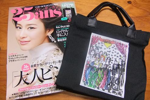 『「エイジレス・ファッションマガジン「25ans(4月号)」』届きました届いた本はこちら今回は、「LANVIN(ランバン)」の素敵なパックが付録です~本体サイズは、約:タテ23×ヨコ24×マチ15cmで、内ポケット付きの手提げト―トパックで、なかなかの収納力~布がとてもしっかりとしていて、付録に付いているパックには思えないですよ~今季のトレンドカラ―は、ピンクだそうです~春というと、桜の花が咲き始めるから、ピンクのイメージがどうしても出てきます~こういう小物からトライするのも良いですねどれも、可愛くて、欲しくなっちゃいますが、小物は、手頃な値段で買えるので、買い求めやすいですよね~どれも、素敵で、目移りしてしまいますが、お財布からにしようかな只今、「25ans3月号(1/28発売)」より定期購読をお申し込みの方に、芦屋ル・タブリエ×25ans特製 姫フリルエプロンをプレゼント(1年、3年共通)こういうエプロンつけて、お料理すると、楽しく作れそうですね~詳しい事はこちらからどうぞエイジレス・ファッションマガジン「25ans(4月号)」