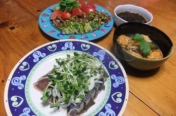 昨日は、デパ地下に買い物に行くと、私が大好きな「青パパイヤ」が最後の1個売られてたので、ゲットしてきました~早速、作った料理はこちらパパイン酵素たっぷりの青パパイヤ料理です!料理名:青パパイヤイリチー作者:まひまひゆかりん■材料(3人分)青パパイヤ / 1/5個(120g)ニラ / 1/2束玉ねぎ / 1/2個人参 / 20g生シイタケ(エリンギ、シメジでも) / 2枚もやし / 1/2袋(100g)ベーコン / 2枚ごま油 / 大1めんつゆ / 大1塩・胡椒 / お好みで■レシピを考えた人のコメント青パパイヤは、三つの分解酵素がたっぷりで、特にダイエットしたい方には最適の食材のようです!詳細を楽天レシピで見る昨夜の食卓「青パパイヤイリチー」「トマトと海藻サラダ」「マグロのスタミナ漬け」「男前豆腐の食べるら~油かけ」「ふろふき聖護院大根」です~「聖護院大根」、はじっこなので、ちょっと変形気味~息子がおかずが足りないというので、男前豆腐を追加しました~本当、良く食べます~沖縄は、独身の頃に3回程、訪れてますが、こういう沖縄野菜が、当時は苦手で食べてないんです~2年前に、たまたまハワイのKCC朝市で、「青パパイヤサラダ」が売られていて、初めて食べたわけですが、これが、大根サラダみたいな食感で、息子もパパもかなりお気に入りになり、帰国後、沖縄から取り寄せしたり、有楽町にある「わしたSHOP」さんで購入したりと一年中食べてます~沖縄から取り寄せしましたのはこちらのお店です沖縄雑貨 うりずん今週から、お弁当作りもないので、朝もちょっと寝坊ができます~でも、今朝は、またまた寒い朝となりました~今週もよろしくお願いしま~す~にほんブログ村 いつも応援して頂き、感謝しておりますとても励みになりますので、ポチをどうかよろしくお願いします~