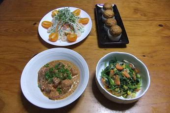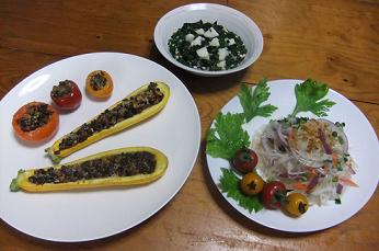 大好きな「ズッキーニ」ですが、まだ肉詰めにした事がないので、早速作ってみました~昨夜の晩御飯「ズッキーニとトマトの肉詰め」「春雨サラダ」「モロヘイヤと雑穀の和え物」です~「ズッキーニとトマトの肉詰め」ですが、「ズッキーニ」は予めコンソメで煮て、詰める中央部はくり抜きます。中の具は、くり抜いた「ズッキーニ」とともに「合挽肉」、みじん切りにした「玉ねぎ」「にんにく」「セージ」を炒め、塩、胡椒、ケチャップで味付け、野菜に詰め、パン粉、パルメザンチーズを振りかけ、魚焼きグリルで焦げ目をつけるまで、焼き上げました~野菜の旨味がお肉と絡まって美味しかったです~パパと息子は、各自1皿食べてますが、私は、トマト1個とズッキーニを少々味見~トマト、在庫が少ないですが、美味しさ、じっくりと堪能中~「春雨サラダ」をズーム~春雨、大根、人参、ア―リ―レッド、カイワレ大根をナンプラーべ―スのピリ辛ドレッシングで和え、砕いた干しエビをトッピングしました周りに、セロリの葉と2色ミニトマトを飾ってます~「モロヘイヤと雑穀の和え物」をズーム~雑穀米をご飯に混ぜるだけではなく、色んな料理に使ってもというのを本で見て、早速、「モロヘイヤ」「長芋」と和えましたが、これが硬めに茹でてるので、食感が良く、なかなか美味しかったですよ~「モロヘイヤと雑穀の和え物」今日は、息子の親友のママ友と幕張のホテルへランチしてきま~す~彼女に、先月、長崎の友達と行った「ホテルニューオータニ幕張」さんの「スィート&サンドイッチブュッフェ」の話をしたら、「私も行きたいわ~」と言うので~ちょうど、今日まで、JAF会員のお得な料金なので、ちょうど良かったです~毎度ながら、彼女と一緒だと、笑えるし、楽しいしで、また、楽しい日記が書けそうで~す前回食べれなかった「クロワッサン」も食べる予定~皆様も、かなり猛暑が続いておりますので、お出かけの際は、くれぐれもお気をつけてくださ~い~では、用意して出かけますね~にほんブログ村 いつも応援して頂き、感謝しておりますとても励みになりますので、ポチをどうかよろしくお願いします~