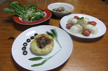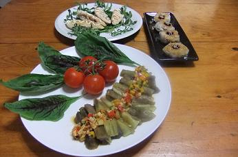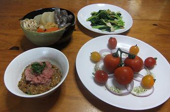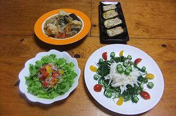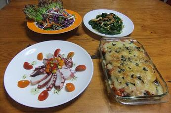 最後まで行ったのに画面が消えてしまい三度目の挑戦~昨日は、朝からカンカン照りでしたので、冷え冷えのお料理が良いかなあと作りましたのがこちらの晩御飯「タコのマリネ」「野菜サラダ」「茄子とトマトのチーズ焼き」「明日葉とベーコンの炒め物」です~「タコのマリネ」をズーム~昨日の「トマトバスケット」から、2色のミニトマトを飾り、中央部には、カラーピーマンとアーリーレッドのみじん切りをタコと一緒にマリネ液に漬けこんで、飾りました~冷え冷えのタコ、食欲増進で~す~「茄子とトマトのチーズ焼き」は、昨日のパスタで使用した残りのトマトソースを使用し、「トマトバスケット」からは、ミディアムトマト3個をスライスしたものも使用したので、トマト好きにはたまらなかったで~す~チーズの上には、フレッシュバジルのみじん切りを振りかけ、魚グリルでチーズが溶けるまで焼きあげましたが、ガスの方が早くて便利~「茄子とトマトのチーズ焼き」「明日葉とベーコンの炒め物」ですが、明日葉を炒めてみたのは、今回が初めてでしたが、葉のみ使用でしたが、葉がもさもさしていて、パパが苦手~と~やはり、茹でて、和え物にした方が良かったみたい~トマトは、まだ残ってますが、他のお野菜がかなり寂しくなってきたので、今日は、これから買い物に行ってきますね~にほんブログ村 いつも応援して頂き、感謝しておりますとても励みになりますので、ポチをどうかよろしくお願いします~