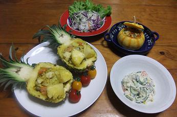 息子が珍しく、パイナップルが食べたいというので、久々に小振りのパイナップルを買ってきて、作りましたハワイアンな食卓~昨夜の晩御飯「パイナップル入りピラフ」「卯の花とゴーヤサラダ」「野菜サラダ」「プッチーニのグラタン」です~昨夜の「パイナップル入りピラフ」は、シーフードミックスを加えて、カレー味のピラフを詰めました~「パイナップル入りピラフ」「プッチーニ」のグラタンですが、坊っちゃんかぼちゃと比べると、味が淡白のような昨日は、レシピブログさんで仲良くしてくださっているRuneさんが、「卯の花とアポカドのサラダ」作られており、アポカドがなかったのですが、どうしても食べたかったので、ゴーヤで代用して作らせて頂きました~「おから」「人参」「ゴーヤ」「紫玉ねぎ」「コーン」「きゅうり」を使用しましたおからもゴーヤも、マヨ味で食べると、とても食べやく、パパも息子も喜んで食べてくれました~一見、ポテトサラダに見えますが、卯の花サラダですRuneさん、いつも美味しいレシピを教えて下さり、どうもありがとうございます~Runeさんの「卯の花とアポカドのサラダ」の詳しいレシピはこちらから~Runeさんには、先日upしました「ケーキサクレ」を作って頂きました~「Rune」さんは、アメリカ在住なので、ホットケーキミックス粉不使用でも、こんなにふっくらとしたでき上がり、素晴らしいです~レシピプログさんで仲良くして頂いている「プクリンママ」さんは、「スパイシーアヒポキ」を作ってくださりました~また、こうやって見ていると、食べたくなります~「Rune」さん、「プクリンママ」さん、作ってくださり、どうもありがとうございました~他の方にも作って頂いたお料理が届いてますので、順次、ご紹介させて貰いますね~にほんブログ村 いつも応援して頂き、感謝しておりますとても励みになりますので、ポチをどうかよろしくお願いします~
