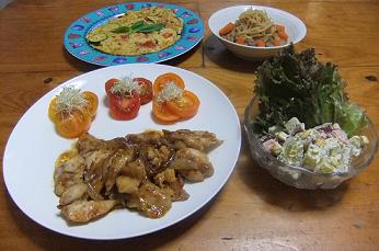 トマトバスケットのトマトを堪能中の我が家ですが、久々にお肉料理を男衆二人の為に作りました~昨夜の晩御飯「チキンソテー 3色トマト添え」「さつま芋のサラダ」「切干大根と揚げ麩の煮物」「夏野菜のオムレツ」です~「チキンソテー」をズーム~これで、男衆1人分ですが、醤油べ―スの味付けですが、豆板醤、パパが買ってきたりんごジュースを隠し味にちょっぴり入れ、勿論、スタミナつくようにすりおろしたにんにくも投入~お肉料理は、色合いが悪いので、トマトバスケットの中から、「3色ミディトマト」と「アルファルファ」を飾りました~ちょっとは、可愛くなりましたかね私は、1切れ頂いて終わり~男衆二人は、大喜びで完食~「夏野菜のオムレツ」をズーム~「ミディトマト」「玉ねぎ」「ズッキーニ」「ブナピー」「2色カラーピーマン」を使用し、焼き上げたオムレツですが、裏に返す際に、失敗しました~奥の方が、かなり歪ですみません~でも、ガラムマサラをちょっぴり加えただけで、ほのかな香りが食欲そそりました~パパも息子も、これまた美味しいと~「夏野菜のオムレツ」切干大根と合わせたのは、「仙台麩」ですが、油揚げの代わりに入れましたが、コクも出て、美味しかったです~昨日は、生協の店舗にも買い物に行きましたが、なんと、改装オープンの為、休業中でした~他のスーパーへ行きましたが、特にこれといって、ピンとくる野菜はなく、かなり寂しかったですが、トマトバスケットには、まだ少しトマトが残っているので、何とか、元気復活そうそう、トマトって、美肌効果もあるみたいですよ~若い時、いえいえ、子供の頃から海が大好きなので、かなりの紫外線を浴びてますが、ママ友に、しみ、そばかす少ないよね~って言われるのも、トマト効果かしら特にここ数年は、一年中、たくさん食べてます~皆さんも、トマト、いかがですか今日も、朝からかなり暑いです~皆様も、お体気をつけてお過ごしくださ~い~にほんブログ村 いつも応援して頂き、感謝しておりますとても励みになりますので、ポチをどうかよろしくお願いします~