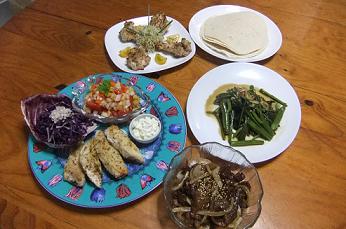 昨夜は、ついついビールがすすみ、またまた早くダウンしましたので、皆様のコメントのご返事ができず、ごめんなさい~猛暑が続いているので、こういう時は南国料理が一番ですね~ハワイで必ず食べるのがメキシカン料理のタコスなんですが、トルティーヤが近所のデパ地下に売ってたので、買ってきて作った昨日の晩御飯私が大好きなマヒマヒ(シイラ)、これはなかなか関東では売られてないので、生協から届いたびんちょう鮪の切り身で代用して作りました~左のプレートをズーム~サルサソースは、「新玉ねぎ」、「赤、黄、オレンジカラ―ピーマン」、「カクテルトマト」、「セロリ」をみじん切りにし、簡単に「レモン汁」、「タバスコ」、「胡椒」で味付けしました左手前には、「トレビス」の上に「紫きゃべつ」の千切り、「エシャロット」のみじん切りを乗せました~白いのは、サワークリームワカモレがないのは、昨日、アポカドを食べちゃってなかったからで~す~右手前のは、牛肉と玉ねぎを炒め、市販のアジアンソースで味付けしたものです白ごまを振りかけたので、ちょっと栄養化upしたかしら左奥のチキン料理をズーム~ご飯を炊いてないので、大食い男衆のお腹が満腹になるのか不安もあり、作りましたが、鶏手羽元にペッパーミックスを振りかけ、魚焼きグリルで焼き上げました~パサつかないように、肉の裏側に少々、オリーブオイルを塗って焼きました皮はパリッとしていて、なかなかジューシーで美味しかったと~中央には、アルファルファと突き刺してるのは、何と、レモングラス~少しでも、爽やかな気分になれるかなあと思って~私は、マグロのタコスのみで、こちらは食べれない~右奥は、「空芯菜炒め」です昨日は、午前中に息子の誕生ケーキを買ってきました~「Cキューブ」さんの二段のケーキです~パパが、自分の時は、こんな豪華なケーキではないと、やきもち焼きましたが、無視で~す~やはり、プロが焼いたケーキは、スポンジがふっくらしていて、たまらない美味しさでした~アンリシャルパンティエさんのグループなので、お味はお墨付きですよ~今日も、朝からカンカン照りで、暑くなりそうです~皆様も、水分たっぷり摂られて、お過ごしくださいね~にほんブログ村 いつも応援して頂き、感謝しておりますとても励みになりますので、ポチをどうかよろしくお願いします~