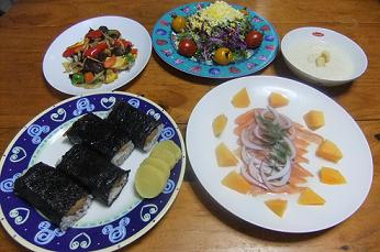 昨日、今日と、朝からとても涼しくて過ごしやすいです~昨夜の晩御飯「コリンキーのカルパチョ」「白なすとソーセージのミルフィーユ仕立て」「ミモザサラダ」「切干大根とトマトのコンソメ煮」です~昨日買ってきたお野菜様真ん中の手前にいらっしゃるのが「コリンキ―」様ですが、かぼちゃの種類で、皮ごと生で食べるようです~「コリンキーのカルパチョ」をズーム~なので、カルパチョにしましたが、シャキシャキしていて、妙に箸が進みま~す~半分、3人で食べちゃいました~右手前にいらっしゃるのが「白なす」様ですが、琉球ソーセージとともにサンドして作りましたのがこちらバルサミコ酢べ―スのソースを間に塗り、周りにもデコしてみました~白なすは揚げましたよ~米茄子同様、皮が硬いかな茄子好きには、たまらなく美味しかったです~レシピは後日でも...レシピブログで親しくさせて頂いているmeson2009さんが、先日、切干大根を使ってイタリアン料理を作られていて、他の料理で油を使用したので、煮物で作らせて頂きました~「切干大根とトマトのコンソメ煮」見た目は、茶色いですが、醤油は使ってません~フレッシュトマトとともに煮ましたが、トマトも美味しさを醸し出してますよ~meson2009さん、洋風な切干大根の使い方を教えてくださり、どうもありがとうございました~ぜひぜひ、次回は、meson2009さんの和え物に挑戦させて頂きますねmeson2009さんの「切干大根でイタリアン風」のレシピはこちらから~先日に引き続き、つくれぽしてくださった方をご紹介~ハワイ繋がりで、かなり前から親しくさせて頂いているプルメリアさんが「スパイシーアヒ」を~私よりも、たくさんハワイに行かれているプルメリアさんが、かなり絶賛してくださり、私も嬉しい~楽天ブログのお友達のCherryさんは、「茄子とトマトのチーズ焼き」を作ってくださりましたちぇり~さんご一家、満足して頂けたみたいで、これまた私も嬉しい~ちぇり~さん一家も、ハワイ好きなご家族~プルメリアさん、ちぇり~さん、作って頂き、ありがとうございました~にほんブログ村 いつも応援して頂き、感謝しておりますとても励みになりますので、ポチをどうかよろしくお願いします~