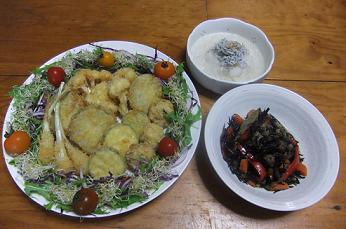 レシピブログさんのお友達vegelifeさんが、先日、作られてた「茄子そうめん」がとても美味しそうで、つくれぽさせて頂きました~昨夜の晩御飯「茄子そうめん」「合鴨のサラダ」「きびなごのから揚げ」「人参のしりしり」です~「茄子そうめん」をズーム~vegeさんは、「絹かわなす」で作られていましたが、手に入らないので、普通の茄子でアク抜きした後、片栗粉を塗して、茹でましたが、つるんとした喉越しがたまらなく美味しかったです~納豆、オクラの代わりに、めかぶ、みょうがで作らせて頂きましたが、パパも息子も美味しいと喜んで食べてくれたので、良かったです~vegeさん、素敵なレシピを教えてくださり、どうもありがとうございました~vegelifeさんの「茄子そうめん」の詳しいレシピはこちらから~今日は、息子も終業式なので、早く帰るようで、これから長~い夏休みが始まります~部活もあるし、家にずっといるわけではありませんが、お昼は、しっかりと準備しなければなりませんし、大変~台風通過がとても気になってますが、千葉は、今のところ、雨は降ってません...皆様も、お出かけの際は、気をつけてくださ~い~にほんブログ村 いつも応援して頂き、感謝しておりますとても励みになりますので、ポチをどうかよろしくお願いします~