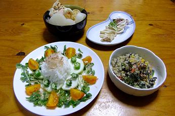 連日、猛暑が続いていますが、食欲はあります~昨夜の晩御飯「イカの一夜干し」「卯の花煮」「長芋とサラダへちまのサラダ」「おでん」です~暑い時に「おでん」、パパの帰りが遅いが家で食べるというので、煮ておくとラクですからね~ちょっと、パパの為に大根をたくさん煮たので、手前に大きな大根があって、中が見えませんね~「卯の花煮」をズーム~「粉末おから」「人参」「キクラゲ」「コーン」「ほうれん草」「ひじき」「赤カラーピーマン」「桜エビ」を使用しました「おから」に「キクラゲ」「ひじき」「桜エビ」は、鉄分、カルシウム豊富な食材だから、貧血気味の私にはぴったりかなと思って~おからって、地味な食材ですが、滋養豊富なので、たまに食べるようにしてます~味付けは、だし汁、みりん、醤油、砂糖、塩少々です「長芋とサラダへちまのサラダ」をズーム~「長芋」「サラダへちま」「オクラの新芽」「オクラ」「オレンジトマト」を使用し、「削り節」を最後にトッピングしました~ドレッシングは、大根おろしを加えた和風ドレッシングかけて、頂きました~「イカの一夜干し」は、生協から届いたものですが、パパはお酒のつまみに、息子はご飯のおかずにと大好物なんですよ~勿論、各自1皿~今日も朝から晴れていて、暑そう~皆様も、しっかり水分補給されて、お過ごしくださ~い~P.S 明日、つくれぽしてくださった方の御紹介させて頂きま~す~にほんブログ村 いつも応援して頂き、感謝しておりますとても励みになりますので、ポチをどうかよろしくお願いします~