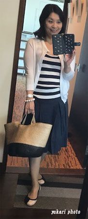 無印のボーダータンクトップにジョンスメドレーのコットンカーディガンを合わせて。