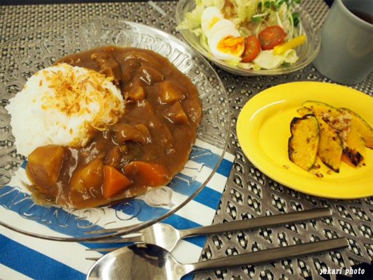 ☆カレーライス(大根、セロリ入り)、☆かぼちゃのココナッツオイルソテークルミ添え、サラダ