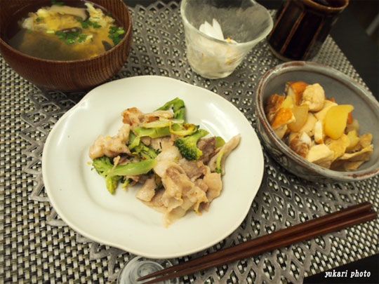 ☆豚とブロッコリーノウェイパー炒め、☆煮物(ささみ、練り物、油揚げ、人参、大根、じゃがいも)、☆新玉ねぎの酢漬けフライドオニオンのっけ、☆吸い物(えりんぎ、玉子、根昆布とろろ、青ねぎ)