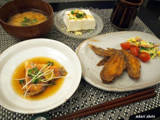 赤魚の煮物、手羽先の甘辛揚げ(まつおか)、☆かいわれ大根と明宝ハムの玉子炒め、アイコ、味噌汁(大根、油揚げ、かいわれ大根)