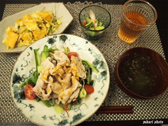 ☆豚肉の冷しゃぶサラダ(ベビーリーフ、海藻、きゅうり、アイコ)、☆厚揚げのチャンプル風(厚揚げ、もやし、かいわれ大根、玉子)、きゅうりの酢の物かにかま入り、吸い物(もずく、根昆布とろろ)