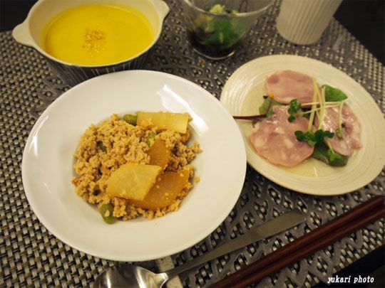 ☆鶏ひき肉と大根の煮物、☆サラダ(明宝ハム、ベビーリーフ、かいわれ大根)、もずく酢とおくら、☆かぼちゃのスープ(かぼちゃ、人参、セロリ)
