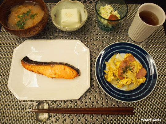 塩鮭、☆フランクフルトと新玉ねぎの玉子炒め、枝豆豆腐(桜塩で)、ツナサラダ(キャベツ、ツナ、トマト)、味噌汁(具忘れ)