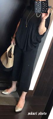 ゴールドのプチプラパンプスをブラックスタイルに合わせて。