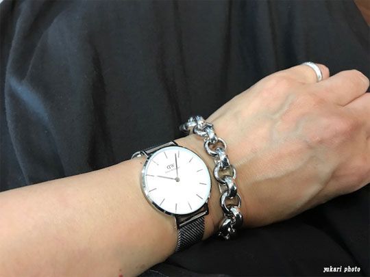 手元はシルバーの靴とイヤリングに合わせて、ダニエル・ウェリントンの新作の時計とセールで買ったAGATAのブレスレットをつけました。