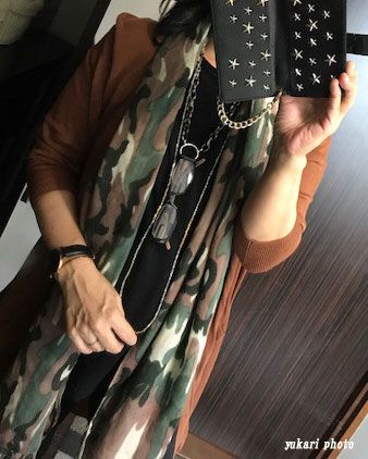 トップスもパンツもブラックだったので、ロングネックレスとリーディングチェーンとストールでアクセントに。