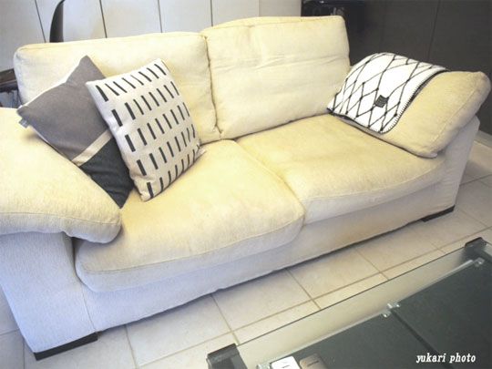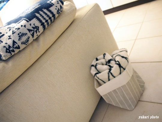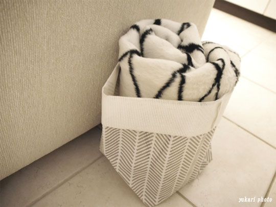 とりあえず、「 bastisRIKE」のブランケットは小さく丸めて、バスケットに入れてソファー横に置いています。