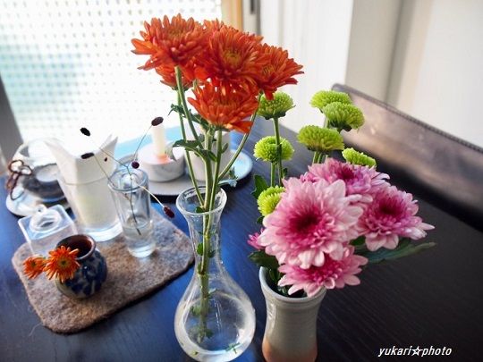 昨日、買い物に出かけたら菊などが一束100yenと安かったので、仏壇のお花とトイレのお花も買いました。