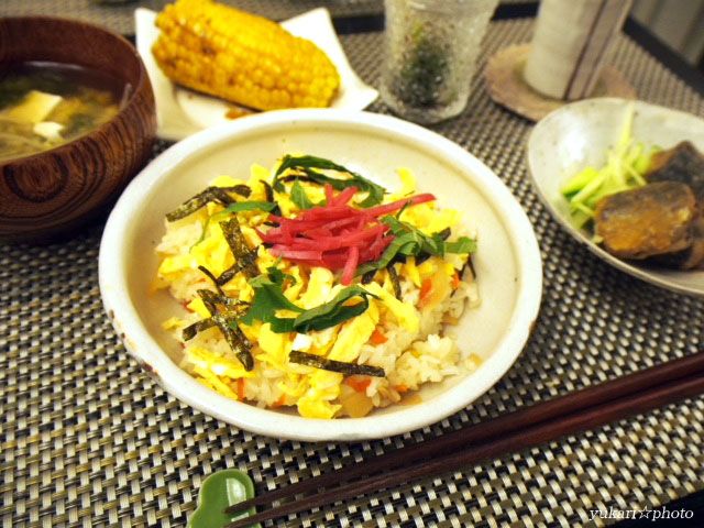 ☆コーン入りちらし寿司、鯵の醤油煮(生協品)、小松菜のおひたし、味噌汁(豆腐、もやし、にら、あおさ)、焼とうもろこし