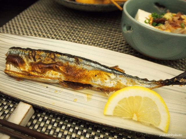 秋刀魚の塩焼き、串カツ(惣菜)、冷奴、サラダ(きゃべつ、トマト、キヌア)、味噌汁(しじみ、青ねぎ)