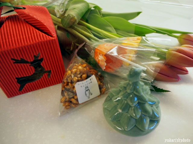 また一緒に格安花屋さんに行って、チューリップとガーベラの花束を2人で分け合いました。