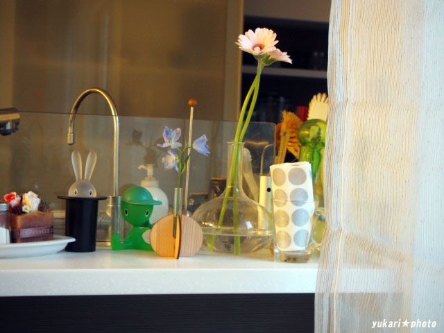 キッチンカウンターにはガーベラとブルーのお花をちょこっと。