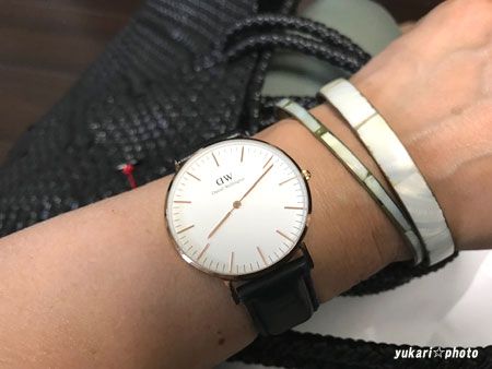 時計はダニエル・ウェリントン、バングルはパンツの色と合わせました。