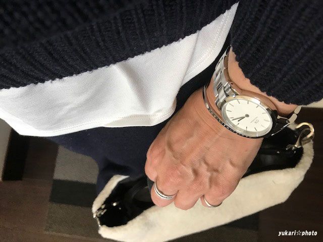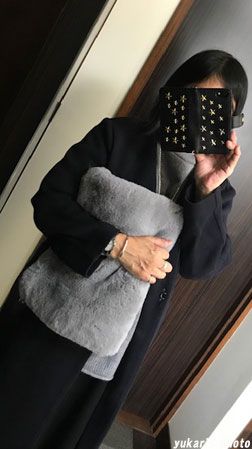 ​このグレーのモフモフクラッチバッグにも 「Iconic Link」の時計、そして今回頂いたリング、以前から愛用しているバングルがよく合います。