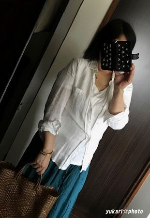 GUの白Tにフランク&アイリーンのシャツを羽織って、スカンツはブルーグリーンを履いて。